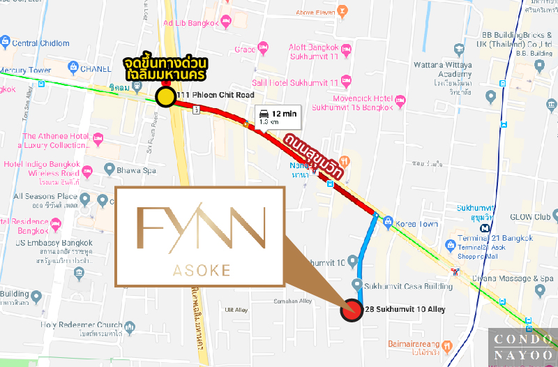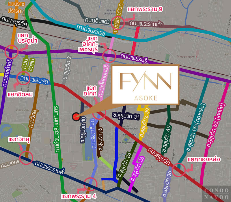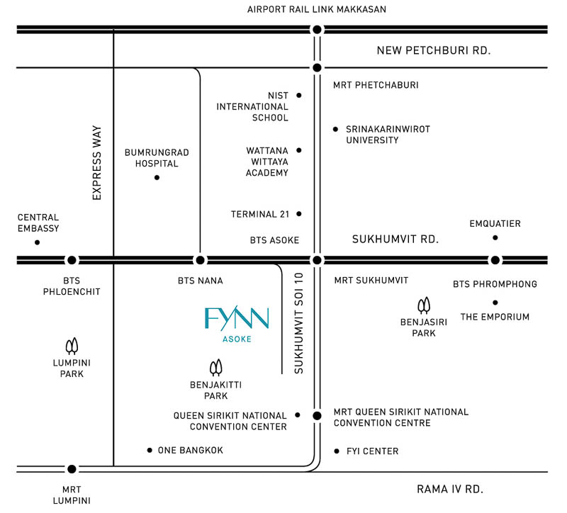 FYNN อโศก ตั้งอยู่ใจกลางเมืองย่านอโศก-นานา ซึ่งเป็นย่าน CBD ที่สำคัญแห่งหนึ่งของกรุงเทพฯ โดยตัวโครงการตั้งอยู่ในซอยสุขุมวิท 10 ห่างจากปากซอยเข้ามาประมาณ 350 ม.* จุดเด่นของซอยนี้คือบริเวณท้ายซอยสามารถเดินเชื่อมเข้าสวนเบญจกิติได้ จากโครงการเพียง 200 ม.* มีทางเดินและทางปั่นจักรยานเชื่อมไปสวนลุมพินีได้อีกด้วย