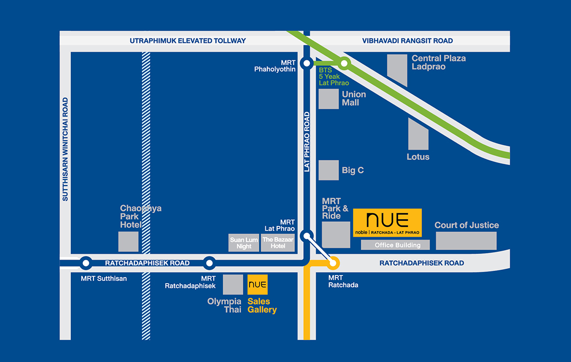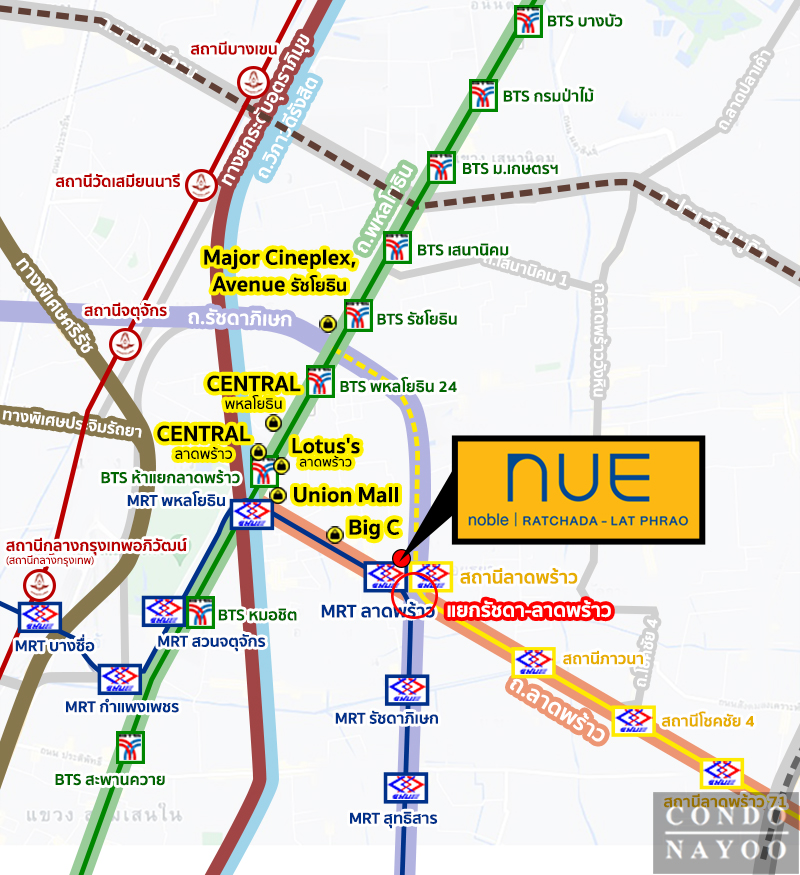 Nue Noble รัชดา-ลาดพร้าว คอนโดใหม่ บนทำเลศักยภาพ ใจกลาง ‘รัชดา-ลาดพร้าว’ ติดรถไฟฟ้าสายสีเหลือง สถานีลาดพร้าว ซึ่งเปิดใช้งานครบแล้ว 23 สถานี / 150 ม.* ถึง MRT ลาดพร้าว และจาก MRT นั่งต่อไปเพียง 1 สถานี จะ Interchange ไปยังรถไฟฟ้า BTS ที่สถานีห้าแยกลาดพร้าวได้