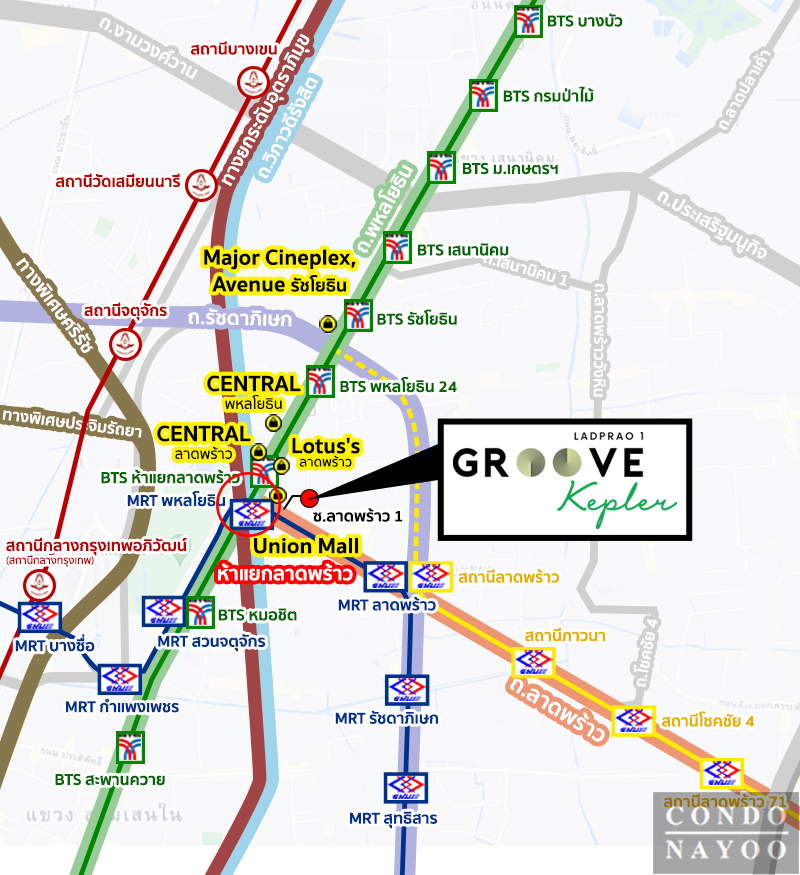 Groove Kepler ลาดพร้าว 1 คอนโดใหม่แต่งครบ จาก Divine Development ที่ตั้งโครงการอยู่ภายในซอยลาดพร้าว 1 ห่างจากถนนลาดพร้าว เพียง 450 ม.* และห่างจากห้าแยกลาดพร้าว เพียง 850 ม.* เชื่อมต่อรถไฟฟ้าใกล้ ๆ ได้ถึง 3 สาย ทั้ง MRT พหลโยธิน, BTS ห้าแยกลาดพร้าว และรถไฟฟ้าสายสีเหลือง ช่วงลาดพร้าว-สำโรง ซึ่งปัจจุบันเปิดใช้งานครบแล้วทั้ง 23 สถานี