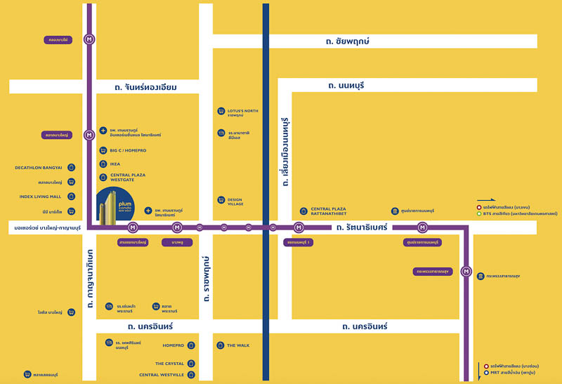 ใกล้รถไฟฟ้าสายสีม่วง MRT สามแยกบางใหญ่ เพียง 400 ม.* และ MRT ตลาดบางใหญ่ 800 ม.* โครงการอยู่ติด Central Westgate และ Ikea บางใหญ่ รายล้อมไปด้วยแหล่งอำนวยความสะดวกครบครัน