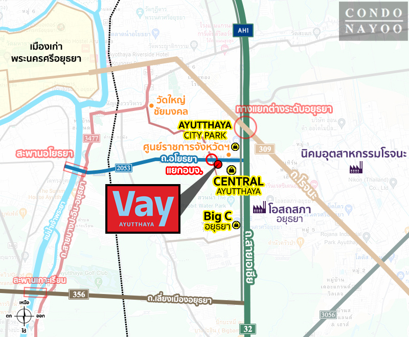 การเดินทางโดยรถส่วนตัว : ที่ตั้งของโครงการ Vay อยุธยา ตั้งอยู่ตรงหัวมุมแยก อบจ. บนถนนอโยธยา สามารถเข้า-ออกได้จาก 3 เส้นทาง คือ จากถนนสายเอเชีย, จากถนนถนนสายบางปะอิน-อยุธยา (หมายเลข 3477) และจากถนนโรจนะ