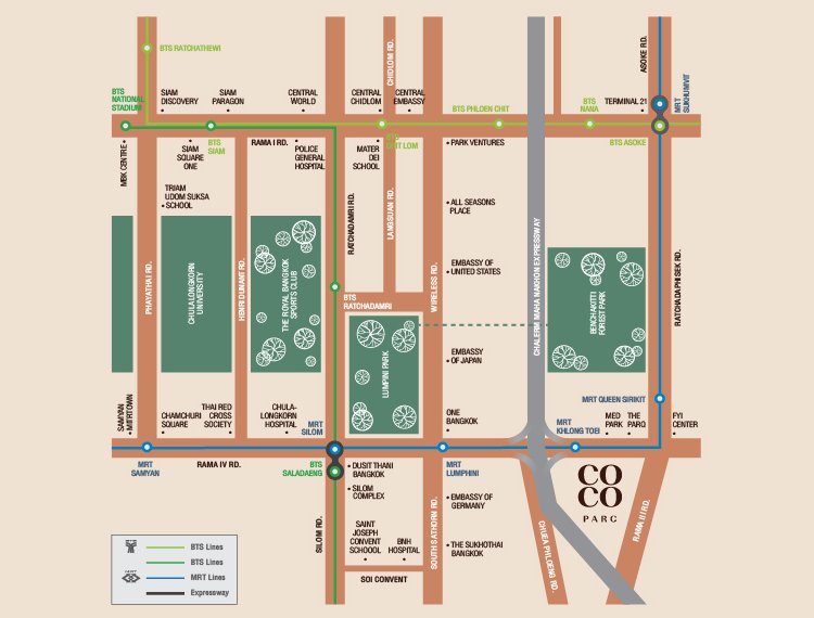 COCO PARC – Branded Residence แห่งแรกของ Ananda Development ที่มาพร้อมบริการระดับโรงแรม 5 ดาว Managed by Dusit Hospitality Services บนทำเลโดดเด่น ใจกลาง Real CBD ของกรุงเทพฯ ติดถนนใหญ่พระราม 4 ทำเลที่มีศักยภาพและการเติบโตสูง สะดวกทุกการเดินทาง ไม่ว่าจะใช้รถไฟฟ้าหรือรถยนต์ส่วนตัว