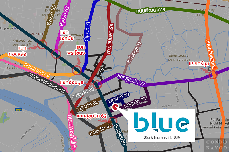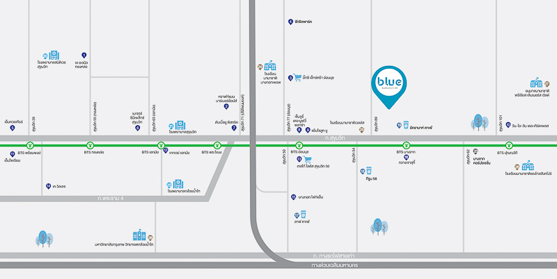 blue สุขุมวิท 89 ตั้งอยู่ในซอยสุขุมวิท 89 จุดเด่นของทำเลโครงการอยู่ห่างจากถนนสุขุมวิทไม่เกิน 100 ม.* การเดินทางสะดวกทั้งรถส่วนตัว และรถสาธารณะ ใกล้ถนนพระรามสี่, ถนนเอกมัย, ถนนทองหล่อ, ถนนบางนาตราด, ถนนศรีนครินทร์ ใกล้ทางด่วนเฉลิมมหานคร ทางด่วนฉลองรัช และทางด่วนบูรพาวิถี