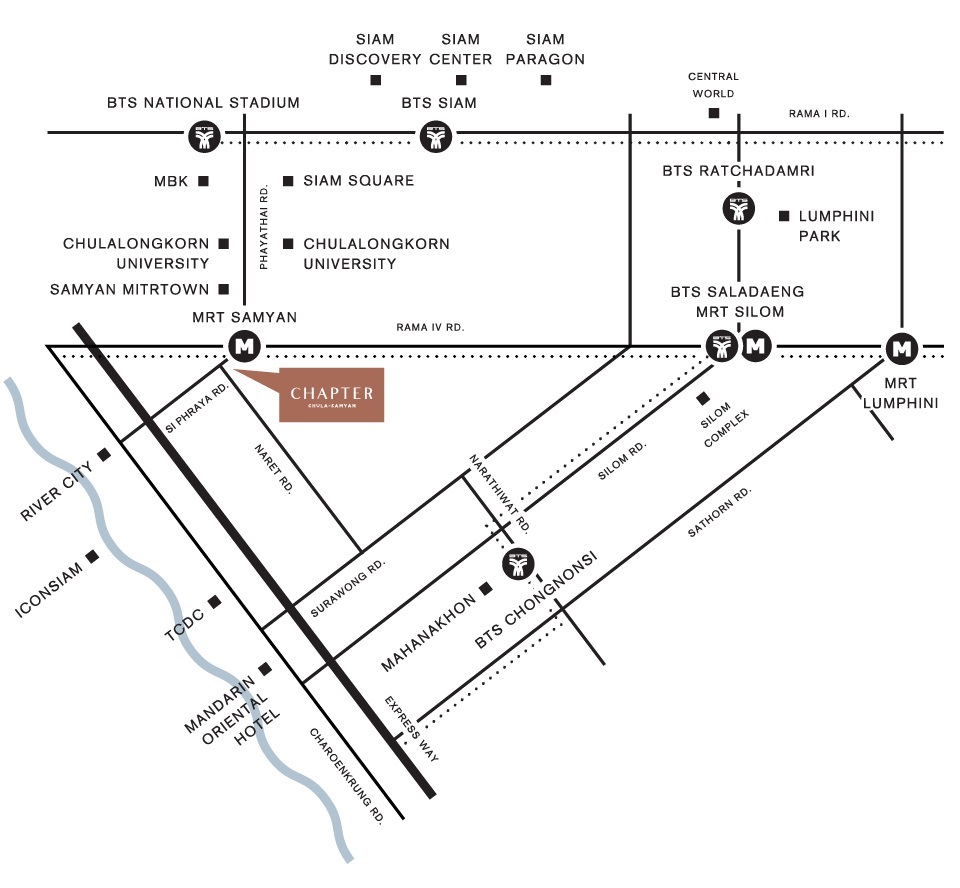 โดยที่ตั้งของโครงการจะอยู่บนถนนสี่พระยา ที่เข้ามาจากแยกสามย่าน ประมาณ 600 ม.* และอยู่ใกล้กับรถไฟฟ้า MRT สามย่าน เพียง 700 ม.* 1 สถานี ถึง MRT สีลม ซึ่งเป็นสถานีเชื่อมต่อกับ BTS ศาลาแดง