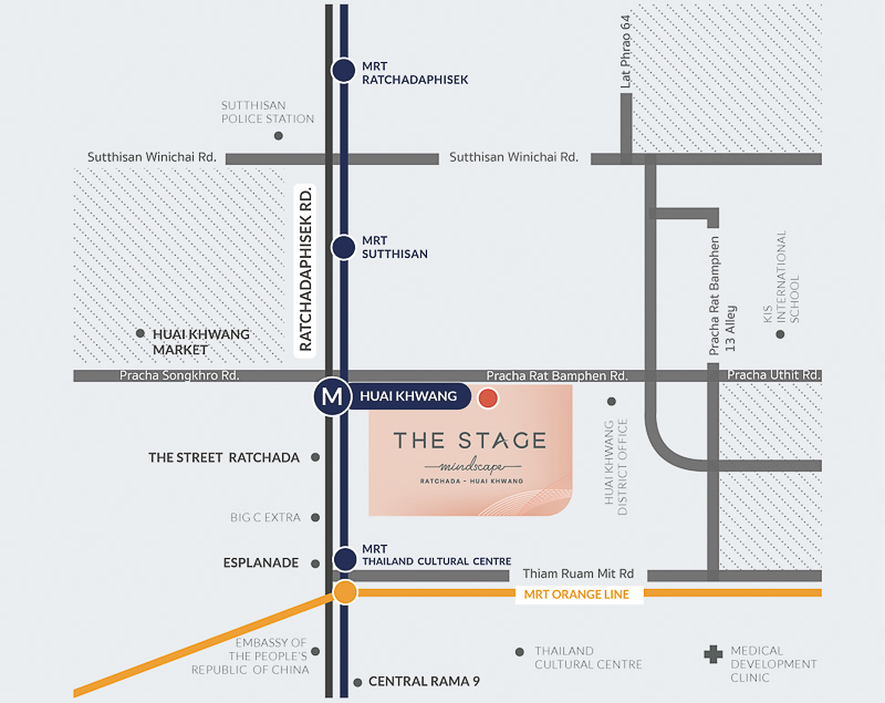 THE STAGE Mindscape รัชดา-ห้วยขวาง อยู่ใจกลางย่านห้วยขวาง ตั้งอยู่บนถนนประชาราษฎร์บำเพ็ญ ซ.6 ตรงปากซอยประชาราษฎร์บำเพ็ญ 6 ห่างจากถนนรัชดาภิเษก เพียง 200 ม.* ใกล้ถนนประชาสงเคราะห์, ถนนประชาอุทิศ, ถนนสุทธิสารวินิจฉัย, ถนนพระราม 9, ถนนลาดพร้าว, ถนนดินแดง, ถนนอโศกมนตรี ใกล้ทางด่วนโทลล์เวย์, ทางด่วนเฉลิมมหานคร, ทางด่วนศรีรัช และทางด่วนฉลองรัช