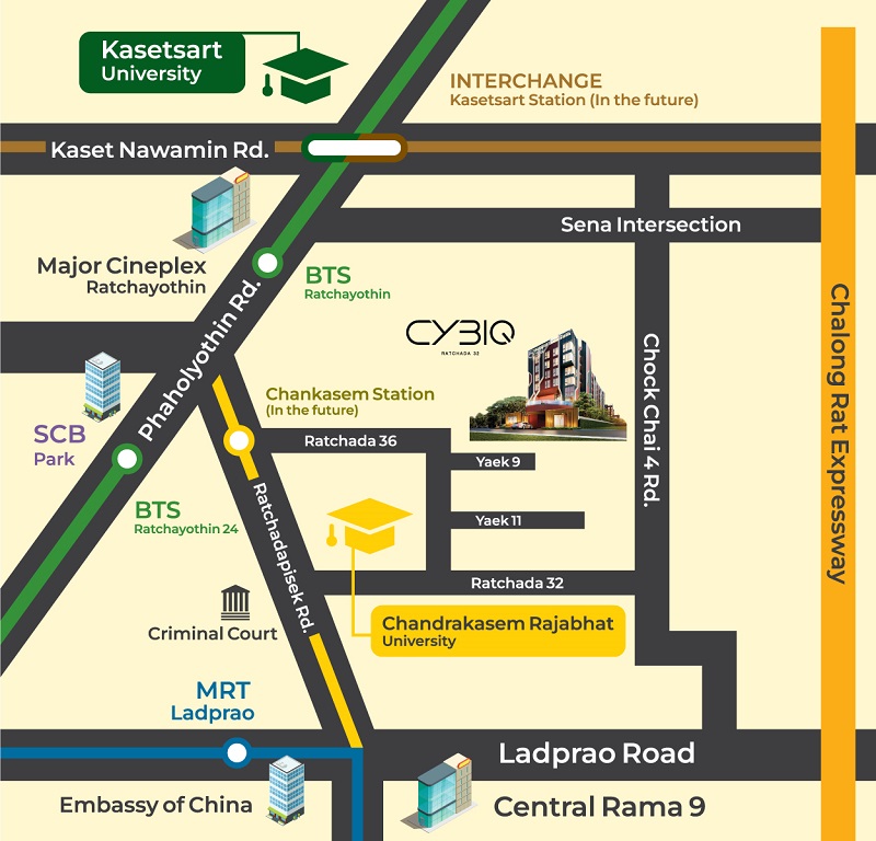 CYBIQ รัชดา 32 ตั้งอยู่ในซอยรัชดา 36 เป็นทำเลหลัง ม.ราชภัฏจันทรเกษม สามารถเข้า-ออกโครงการได้ทั้งจากซอยรัชดา 32 และซอยรัชดา 36 แยก 9 กับแยก 11 ใกล้ถนนใหญ่รัชดาภิเษกที่เชื่อมต่อถนนเส้นอื่น ๆ ได้หลายสาย เช่น ลาดพร้าววังหิน, โชคชัย 4, ลาดพร้าว, พหลโยธิน, ประเสริฐมนูกิจ, ประดิษฐ์มนูธรรม, วิภาวดีรังสิต เป็นต้น