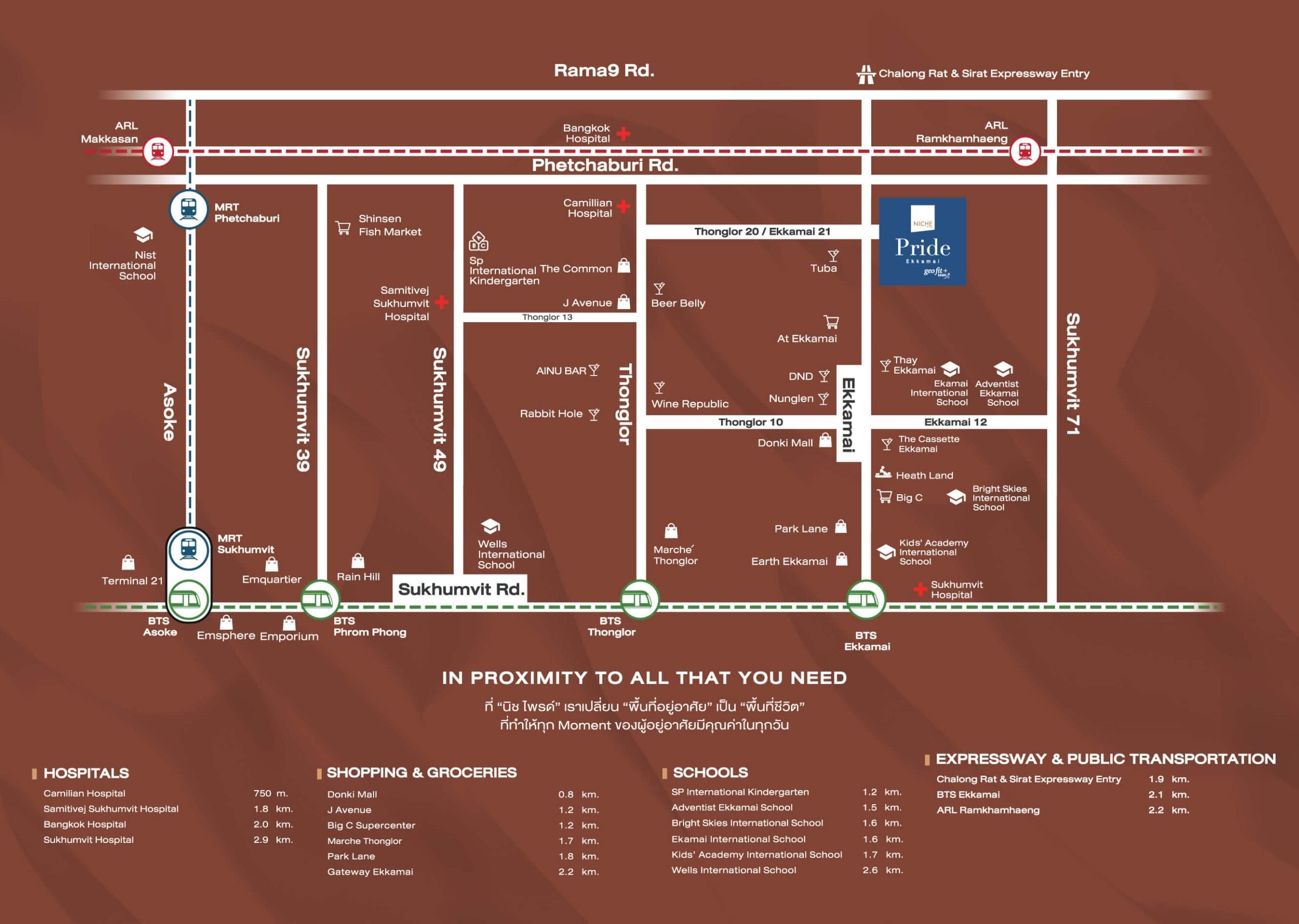 รายล้อมด้วยสิ่งอำนวยความสะดวกรอบโครงการครบครัน ทั้งแหล่ง Shopping, โรงเรียนนานาชาติ, โรงพยาบาล และอาคารสำนักงานชั้นนำ ในระยะเข้าถึงง่าย เดินไปใช้งานก็ง่าย หรือจะขับรถส่วนตัวไปก็สะดวกมาก ๆ