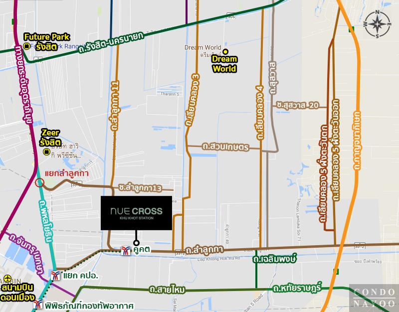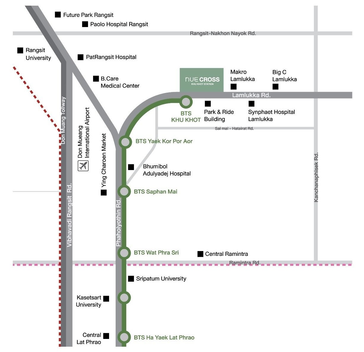 ทำเลที่ตั้ง : โครงการ Nue Cross คูคต สเตชัน ตั้งอยู่บนถนนลำลูกกา บนทำเลศักยภาพย่านคูคต ติด BTS คูคต ซึ่งย่านคูคต เป็น HUB สำคัญใหม่ของกรุงเทพฯ ตอนบนสำหรับเดินทางเข้าสู่ใจกลางเมือง และยังเชื่อมต่อได้หลายเส้นทาง ทั้งถนนพหลโยธิน, ถนนวิภาวดีรังสิต และวงแหวนฝั่งตะวันออก